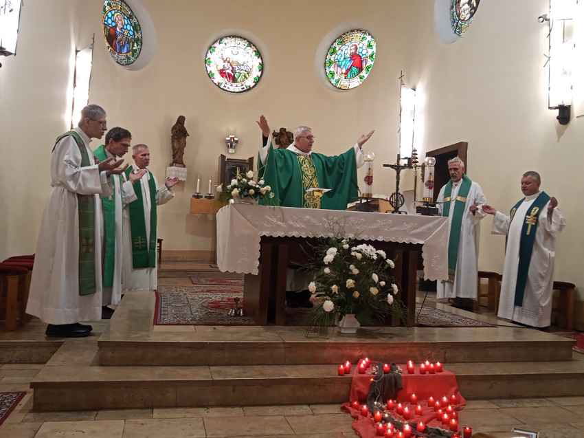 Az elmélkedést kiscsoportos beszélgetés követte, majd a templomba vonultunk át szentmisére. A szentmisét a jelenlevő hat pap koncelebrálta. Almásy Tamás pestújhelyi plébános – az ő segítségével született meg a szervező közösség – prédikációjában a careftai özvegy példájából kiemelte az olaj és kenyér fontosságát az életünkben, felhívva a figyelmet arra, milyen sokféleképpen használjuk az olajat (kozmetikumok, élelmezés, szent kenetek stb.) és a kenyeret (étel, szentség).