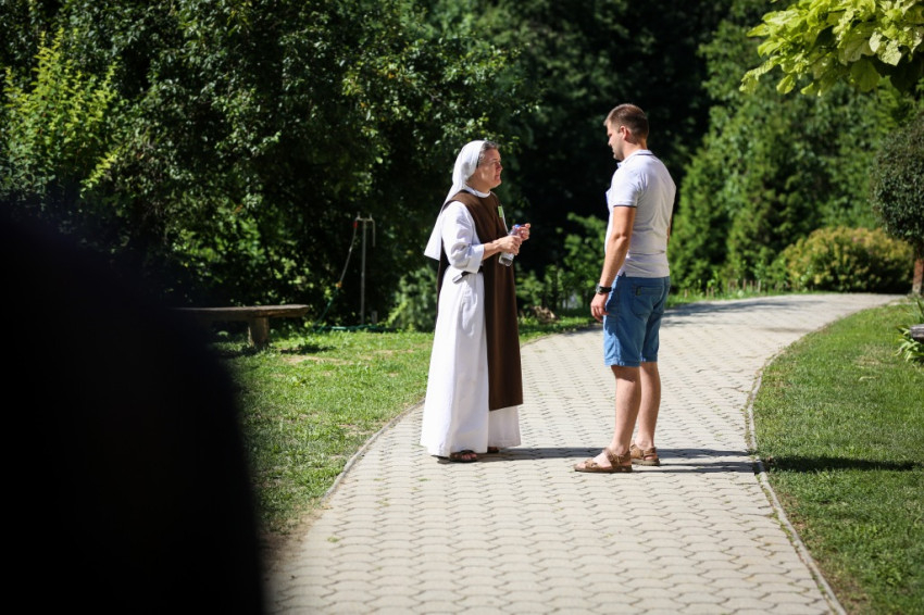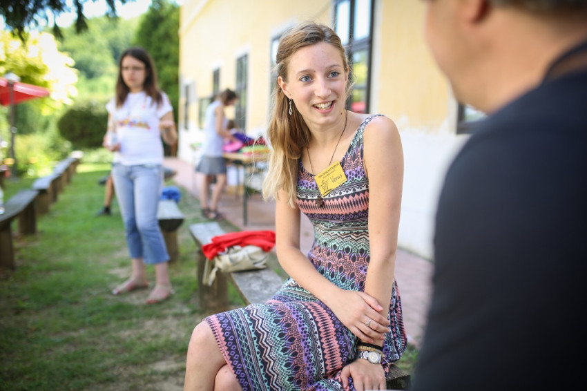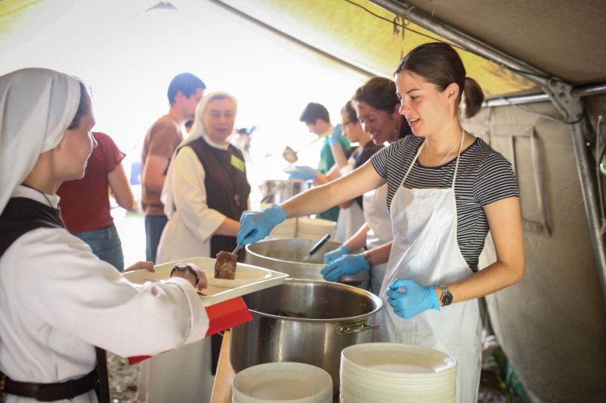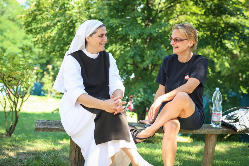 Valter Margit nővér, a tábor vezetője először az étkezősátorhoz visz bennünket, majd a kapott tálcával és oldalassal hosszan keressük a megfelelő beszélgetőhelyet. Végül a rendház étkezőjében ülünk le, és evés helyett beszélgetni kezünk. A fiatalok, akik a táborba jönnek, sokszor ott tartanak, hogy vagy hátrahagyják üresnek érzett vallásosságukat, vagy mélyebbet keresnek helyette, és szívesen mondanak igent a baráti invitálásra, mondja Margit. Élő Isten, élő istenkapcsolat – legtöbbször ez kerül elő, amikor a tábori tapasztalataikról beszámolnak. Arra jöttek rá itt, mesélik gyakran a tábor vége felé, hogy Isten élő személy, akivel kapcsolatban lehet lenni. Annak idején Margit is itt, résztvevőként érezte meg először, hogy Isten mennyire közel jöhet az emberhez.