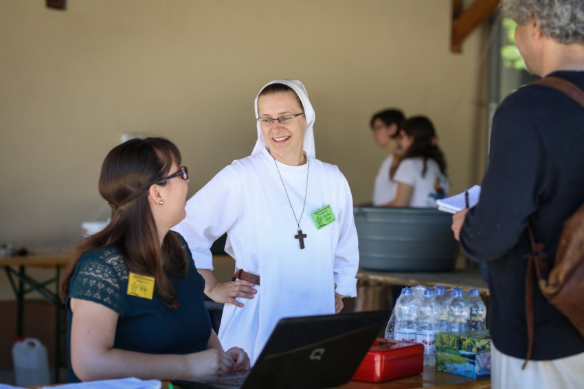Az egyik, laptopnál ülő szervező lánytól megtudjuk, hogy százötven körüli a résztvevők száma, negyven közösségi testvér és barát segít a tábor mindennapi munkáiban, tíz nővér és egy szerzetestestvér biztosítja a hátteret.