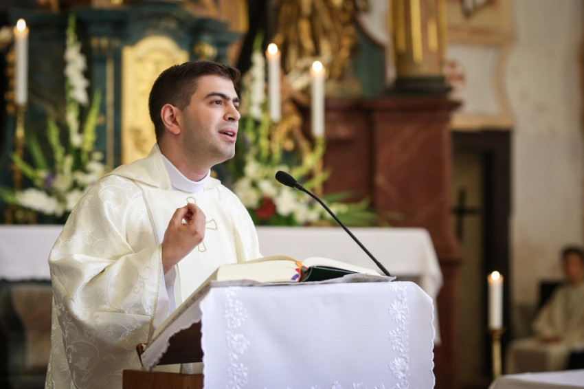 Tízkor a templomban Hatházi Róbert a megváltásról beszél. Összetörtségünkről és gyengeségünkről, amely a bűn következménye, és szárnyalásunk lehetőségéről, amelyet Isten szeretete tesz lehetővé. A megváltás személyességét, személyre szóló voltát hangsúlyozza: Jézus személyesen értem jött el, szenvedett. Ám ma általános, hogy nem tartjuk bűnösnek magunkat, a körülmények áldozataiként tekintünk magunkra. Pedig ahhoz, hogy megszabadíthasson a bűneimtől, be kell látnom, hogy bűnös vagyok. Mintha jobb képet akarnánk festeni magunkról Isten számára, mint a valóság. Pedig éppen vele egészen őszinték lehetnénk, kellene, hogy legyünk. Jézus sebei megmaradnak a feltámadás után. Nekünk is vannak sebeink, mindannyiunknak – de még ezek is Isten kegyelmének jeleivé válhatnak, ha Jézushoz tudjuk vinni őket. Jézus azért jött, hogy megmutassa az Atya arcát. Hogy mi is megpillanthassuk, ahhoz először az kell, hogy igazán elszomorodjunk a bűneink miatt, és igazán fájjanak – hogy aztán a szentségek révén gyógyíthasson az Isten.