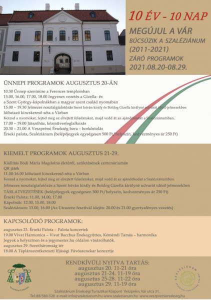 Az érdeklődők augusztus 20-tól tíz napon keresztül még felkereshetik a várban az egyházi látványosságokat, köztük a Szaléziánumot. A turisztikai központ és a veszprémi érsekség látogatóhelyei – az érseki palota, a Gizella-kápolna, a Szent György-kápolna – augusztus 29-ig fogadnak látogatókat.