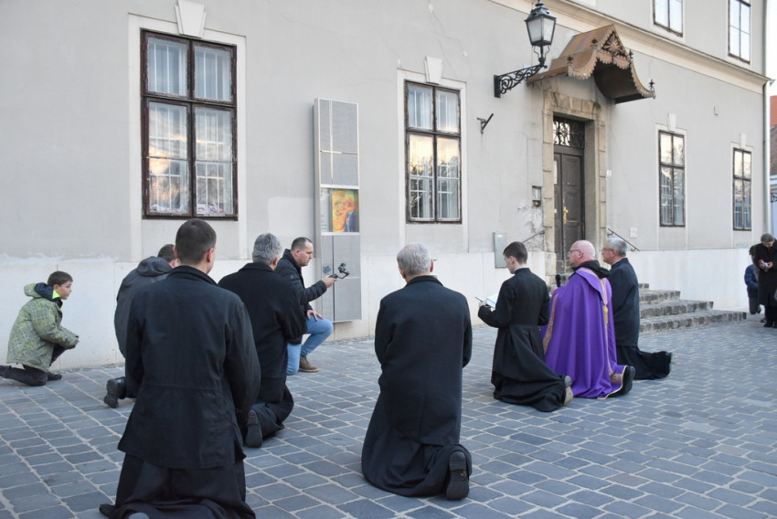 A keresztútjárás előtt fél órával még sötét felhők borították be az eget a győri Nagyboldogasszony-székesegyház felett. Ám hat órakor már kellemes, esti napsütésben indulhatott a közös imádság, amelyet Reisner Ferenc általános püspöki helynök vezetett. Több mint félezren vettek részt rajta. Az imádságok és az énekek tanúságtételként hatottak a zsúfolt belvárosban.