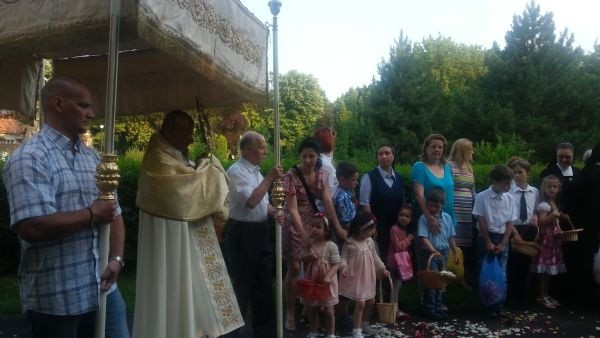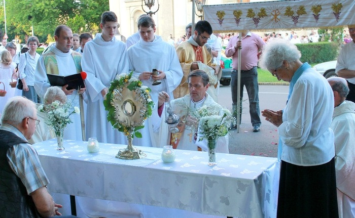 A szentmisét követően indult a körmenet, melynek során végigjárták a püspöki palota kertjében kialakított négy lombsátrat. A főpásztor erre külön meghívta a város plébániáinak ez évi elsőáldozóit és bérmálkozóit, akik rózsaszirmokat szórtak.
