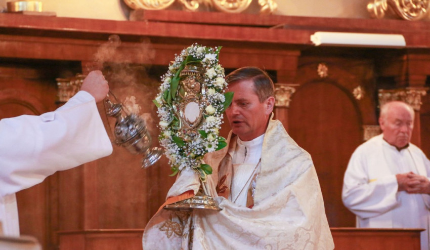 Dicsőíteni jöttünk a kenyér és bor színe alatt köztünk lakó Isten fiát – mondta bevezető beszédében a főcelebráns, Schönberger Jenő püspök a bevonulást követően, majd kifejtette: „Ettől nagyobb ajándékot nem adhatott volna Isten nekünk, mint önmagát. Ezzel mintegy megelőlegezi a mennyországot. Engedjük, hogy a mai liturgia abba a mennyeibe vonjon be mindannyiunkat… Semmi mást nem kell tennünk, csak nagyra nyitni a szívünket és engedni a lelkünkön keresztül a köszönetet, a hálát, a dicsőítést és magasztalást. Mindezt együtt, közösen, hiszen az Oltáriszentség Krisztus-közösséggé épít bennünket. Az ő közössége vagyunk, egy szív, egy lélek vele.”