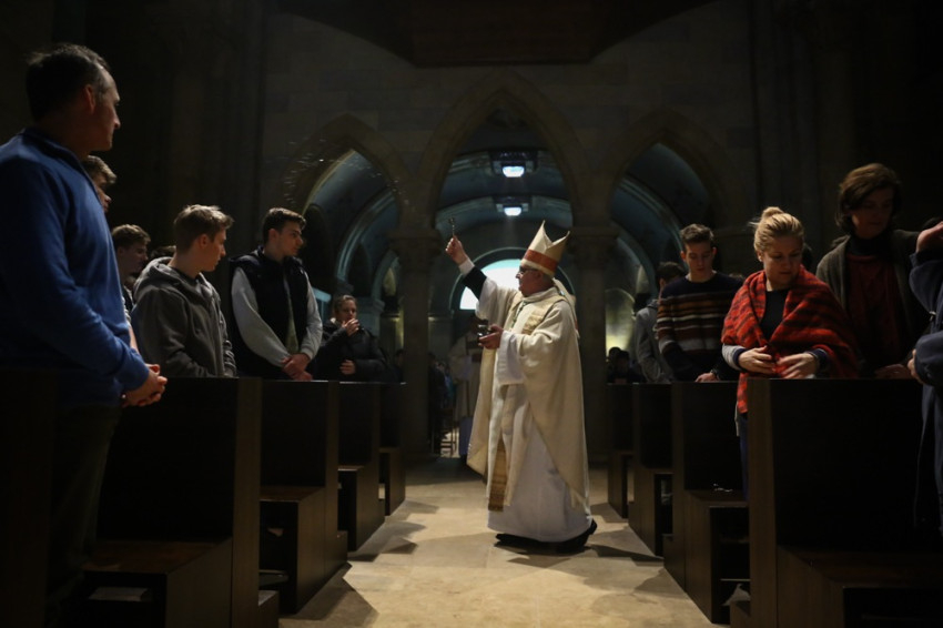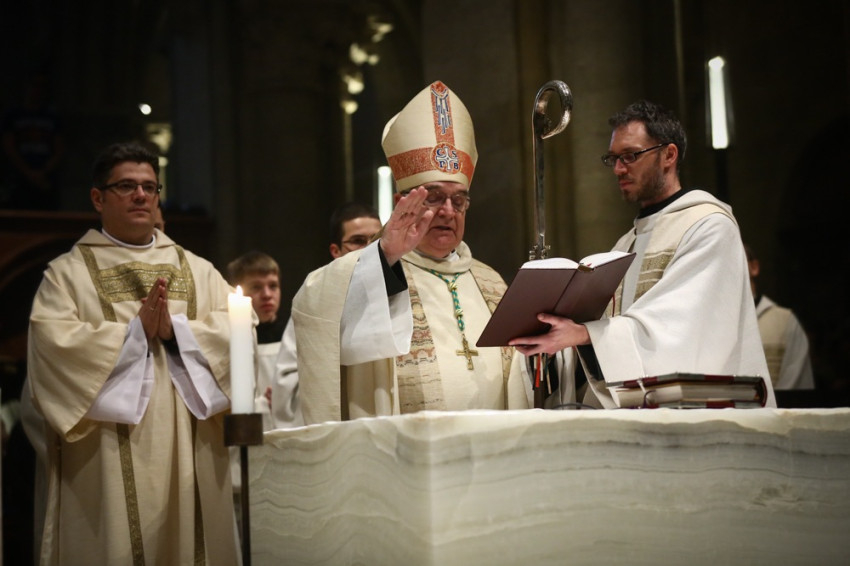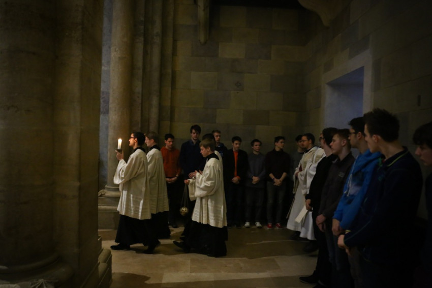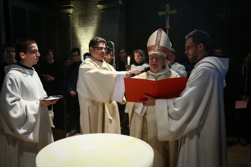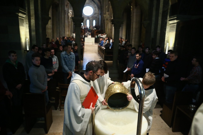 Az ünnepi szentmise kezdetén Várszegi Asztrik a bazilika tornya alatt, a bejárat előtti centrális helyen található keresztelőkúthoz vonult. Miután a ministránsok betöltötték a vizet a keresztelőkútba, a főapát megáldotta a sót és a vizet, majd egybevegyítette őket. Ezután a főcelebráns merített a szenteltvízből, és a templomban körbejárva meghintette a jelenlévőket.