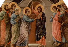 Caravaggio, a barokk korban élt festőművész egyik legismertebb képe ezt a most olvasott jelenetet ábrázolja. Jézus középen áll – hol is állhatna? A köszöntés ugyanaz, mint az előző héten volt. „Béke veletek!” A festő pedig naturalista, mármár botránkoztató módon belehelyezi Jézus oldalsebébe Tamás ujjait. Egy mai sebész szörnyülködve látná ezt a mozdulatot. Tamásban pedig ekkor megszületik a legnagyobb ajándék: a hit. Ki is kívánkozik belőle a hitvallás: „Én Uram, én Istenem!” „Mivel láttál engem, hittél” – mondja Jézus. Ez több mint látás. Tapasztalat: valóban ő az, a názáreti, akit megkínoztak és felfeszítettek! Itt csorog a vér az oldalsebéből! Boldogoknak nevezi Jézus azokat, akik nem kapják meg a közvetlen tapasztalatot, és mégis hittel lesz teli a szívük.