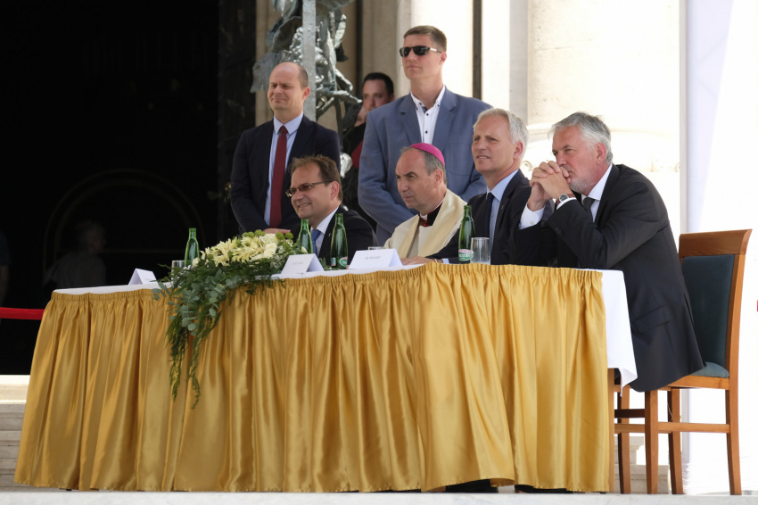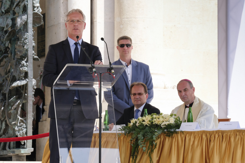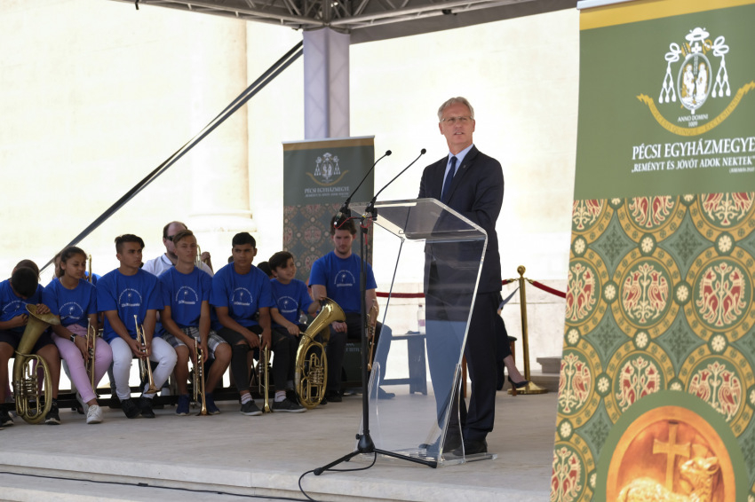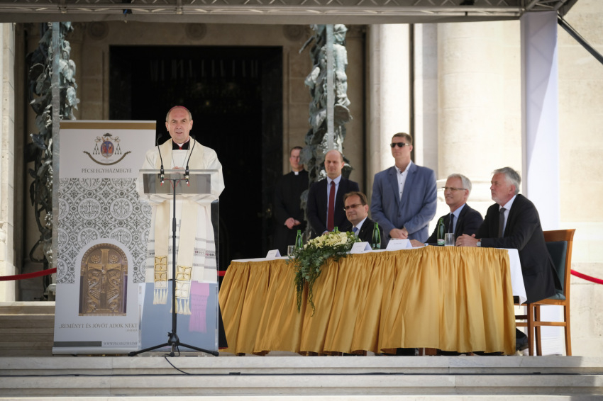 Hoppál Péter országgyűlési képviselő annak jelentőségét emelte ki, mennyire fontos a pécsi identitás szempontjából a tér, melyhez személyes életünkben és történelmi távlatban is ezer szállal kötődünk. Több történelmi eseményt emelt ki, amikor tömegek hit és nemzet melletti tanúságtételének volt a színhelye ez a tér. Rámutatott: a teret azon emberek lelkisége teszi egésszé, akik használják. Reményét fejezte ki, hogy a jövőben a térre érkező hívők és világi tömegek meg fogják tudni tölteni azt harmóniát adó tartalommal, élettel.