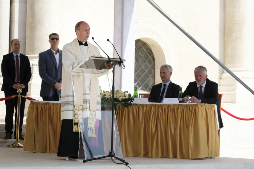 Udvardy György bemutatta a megújító beruházást: az 1891-ben épült tér mind a turisták, mind a zarándokok célpontja; a felújítás ennek megfelelően a szakralitás rendeltetését is szem előtt tartotta: az ivókutak egyszerre biztosítják a tisztálkodás, a felfrissülés lehetőségét, és emlékeztetnek keresztségünkre.