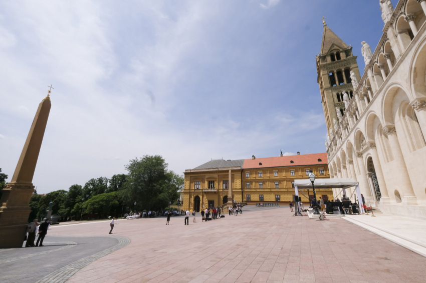 Ezután az ünneplő sokaság a templom elé vonult a tér átadására. A tér magaslatára épült székesegyházzal, a Püspöki Palotával, a Barbakán kerttel, az innen induló Múzeumok utcájával a Dóm tér, a pécsi belváros egyházi központja, világörökségi terület. Ez az emblematikus tér újult meg – burkolatcsere, több ülőfelület, ivókút, növényesítés adnak új színt arculatának, melyet továbbra is a bazilika teljes homlokzati képe határoz meg.