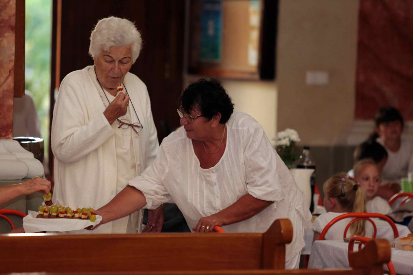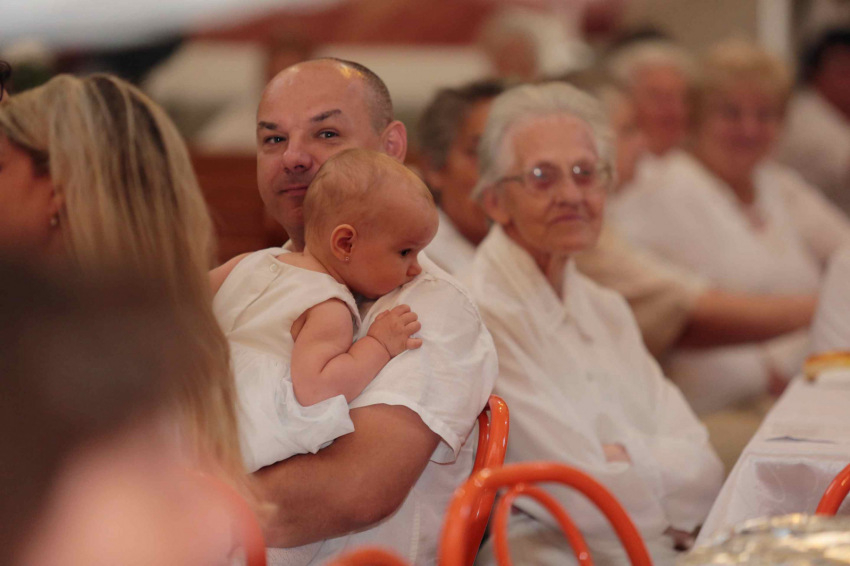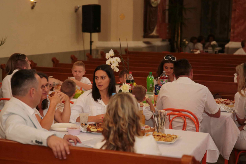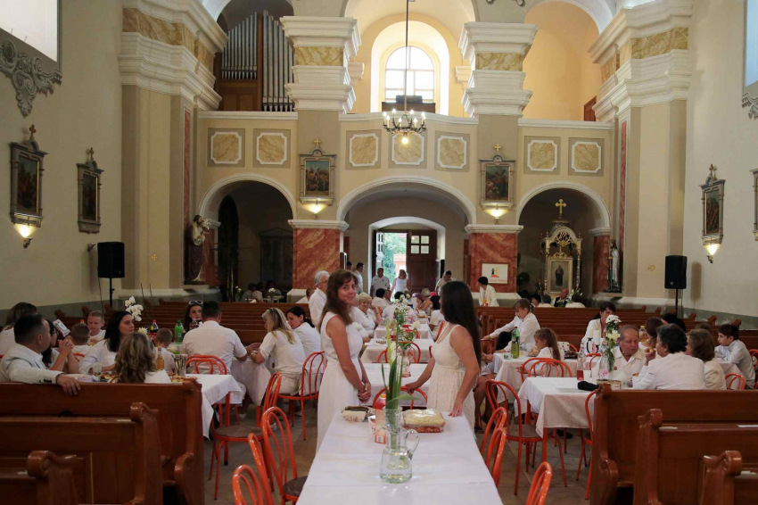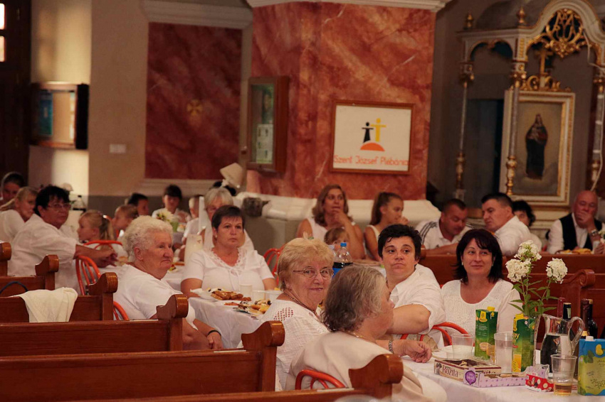 Családok, baráti társaságok, kisebb-nagyobb közösségek, több mint százan érkeztek a programra, melynek ismertetőjegye, hogy fehér ruhában kell rajta megjelenni. Az egyeki templomban a padsorok közt megterített, fehér abroszos asztalok mellett a résztvevők többnyire a saját maguk által készített vacsorát fogyasztották el, de egymást is boldogan kínálták meg ételeikből.