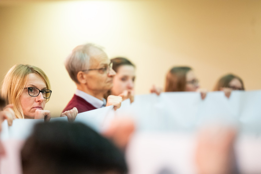 „Amikor azt mondjuk, egy az Úr, nyilvánvalóan Istenre gondolunk, de nem tudunk úgy rá gondolni, hogy ne gondolnánk közben a tekintélyszemélyekre is, a tekintélyre, mely fölöttünk van – magyarázta, miközben a résztvevők maguk előtt tartották a hatalmas papírszalagot.