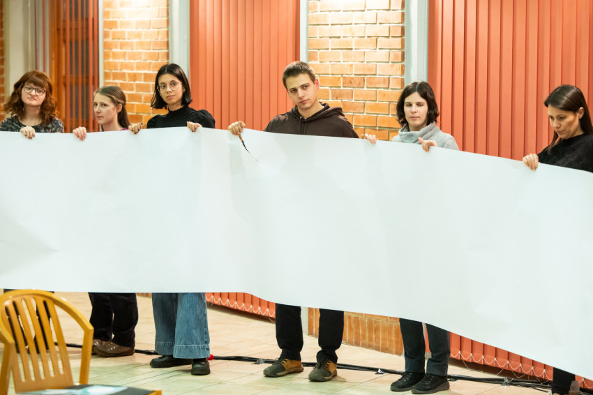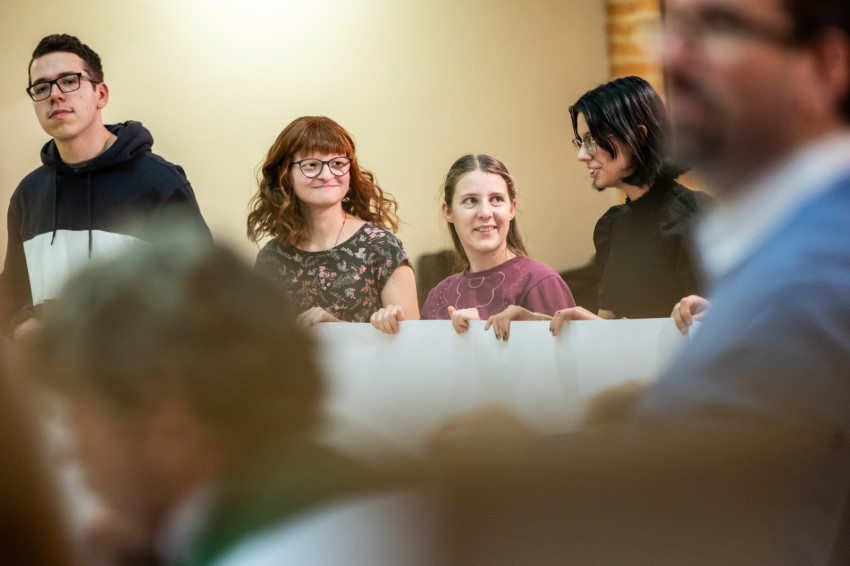 Ennek a jeleként a fiatalok feljebb emelték a papírt maguk előtt.
