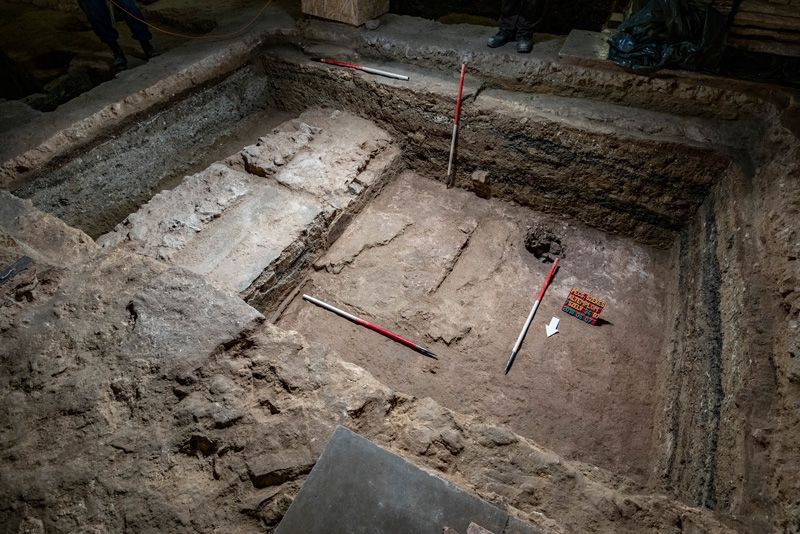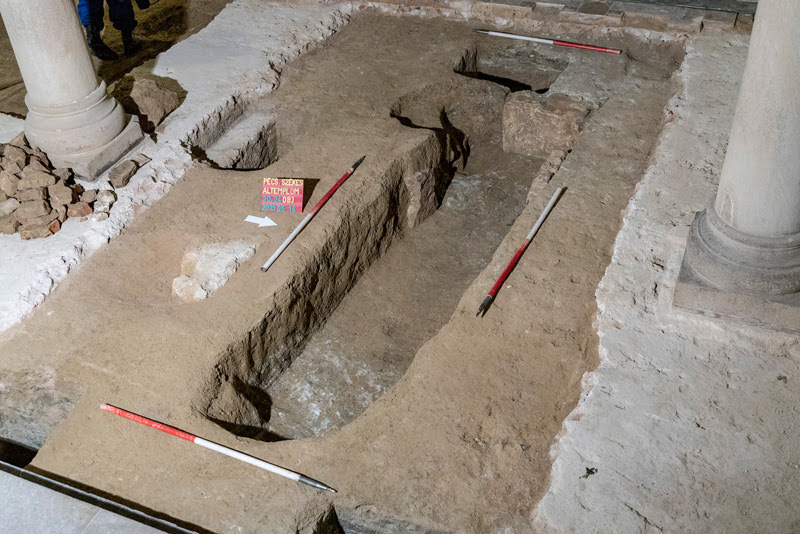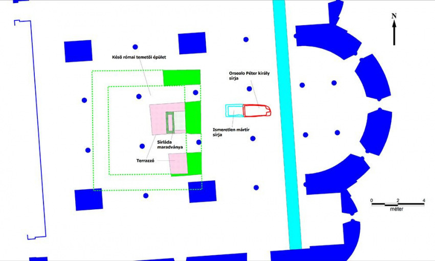 Tóth Zsolt, a feltárás vezetője elmondta, hogy a munkálatok során egy római kori temetői épület maradványaira, a fölé épült első pécsi székesegyház falaira bukkantak, s abban Orseolo Péter király feltételezhetően első, eredeti sírhelyét is megtalálták.