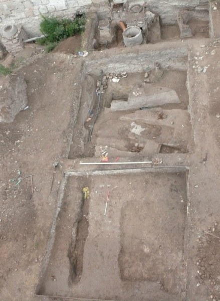 Fotó délről a feltárásról – a jobb felső sarokban a sír nyugati része, a keleti még feltáratlan. A fenti kőfal a 18. századi ferences kolostor.