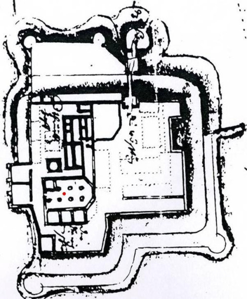A váci vár 17. század eleji alaprajza a háromhajós templommal, pirossal a Géza királyhoz kötött sír helye (Magyarország Régészeti Topográfiája 9. kötet, szerk. Torma István)