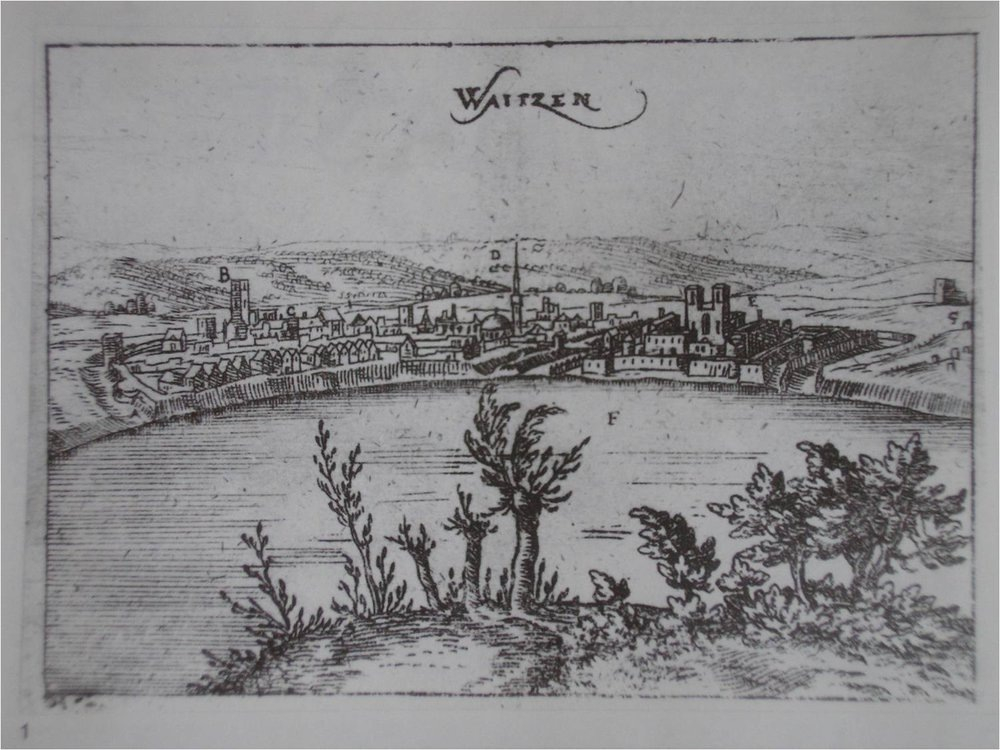 A váci vár Dillich 1600. évi metszetén, jobbra a Szűz Mária-székesegyház két nyugati tornya a vár (E betűvel jelölve) közepén (Magyarország Régészeti Topográfiája 9. kötet, szerk. Torma István)