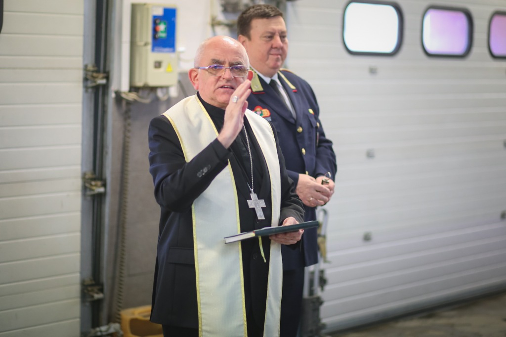 Varga László püspök e szavakkal áldotta meg a tűzoltóság épületét: „Urunk és Istenünk, hálát adunk Neked, hogy vannak, akik akár életük kockáztatásával is készek segíteni bajbajutott embertársainkon. Ezek közé tartoznak a tűzoltók és a katasztrófavédelem munkatársai. Kérünk, áldd meg ezt az épületet, lakjanak itt a békesség és az egység angyalai. Áldd meg, Istenünk, a katasztrófavédelem minden dolgozóját, akik önfeláldozó szolgálatukkal védenek bennünket és értékeinket. Áldd meg családtagjaikat és szeretteiket. Szent Kristóf közbenjárására óvjon meg benneteket minden bajtól a mi Urunk, Istenünk, akkor is, amikor katasztrófa esetén végzitek munkátokat, vagy mikor kiképzésen, készenléti állapotban vagytok.”