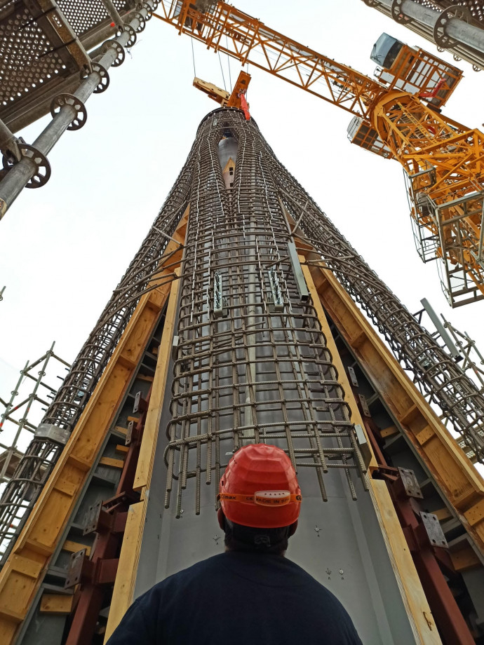 A toronyba fényt engedő nyalábszerű forma, a középső egység 18 méteres; kívülről teljes egészében kék és fehér mozaik fedi majd.