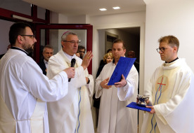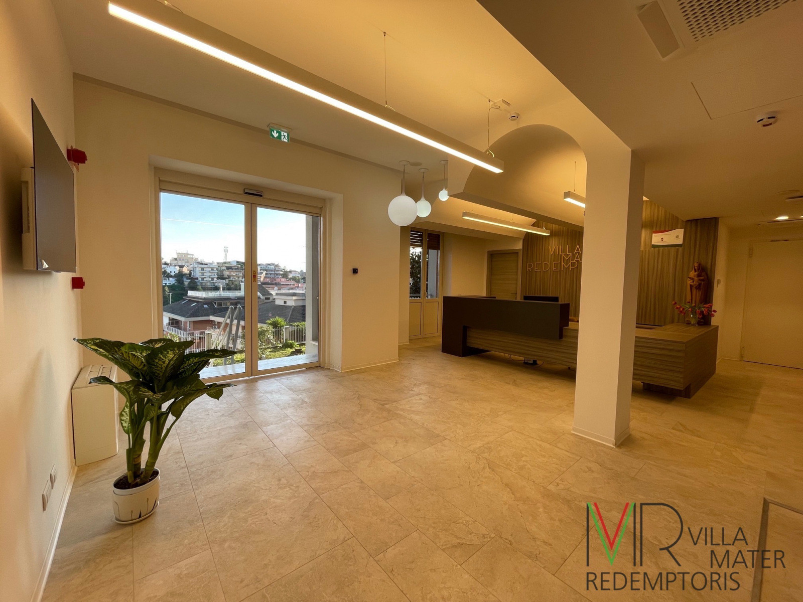A recepció mellett kapott helyet a modern vonalvezetésű kápolna, melynek a klasszikus templombelsőkre utaló, félkörös oltártere bensőséges, imádságra hívó hangulatot áraszt.