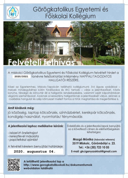 A miskolci Görögkatolikus Felsőoktatási és Kulturális Diákotthon és Romzsa Tódor Görögkatolikus Szakkollégium felvételt hirdet a 2020/21-es tanévre felsőoktatási intézmények nappali tagozatos hallgatói részére. Az intézmény célja, hogy a hazai és a határon túl élő keresztény fiataloknak, egyetemi és főiskolai hallgatóknak lehetőséget biztosítson arra, hogy szakkollégiumi műhelymunkában részt vegyenek, kutatásokban együttműködjenek, a görögkatolikus értékeket és hagyományokat megőrizve.