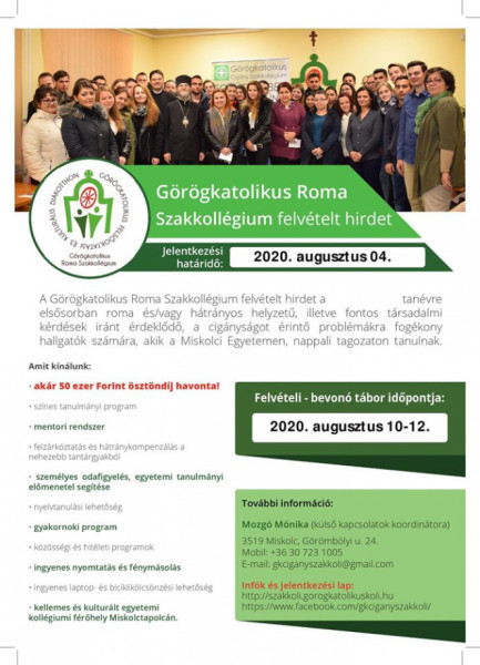 A Görögkatolikus Roma Szakkollégium felvételt hirdet a 2020/21-es tanévre, elsősorban roma és/vagy hátrányos helyzetű, illetve fontos társadalmi kérdések iránt érdeklődő, a cigányságot érintő problémákra fogékony hallgatók számára, akik a Miskolci Egyetemen, nappali tagozaton tanulnak.