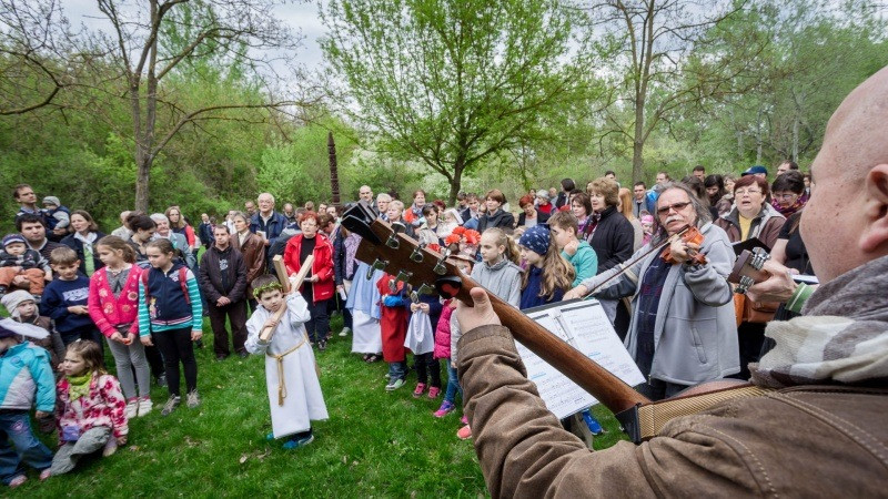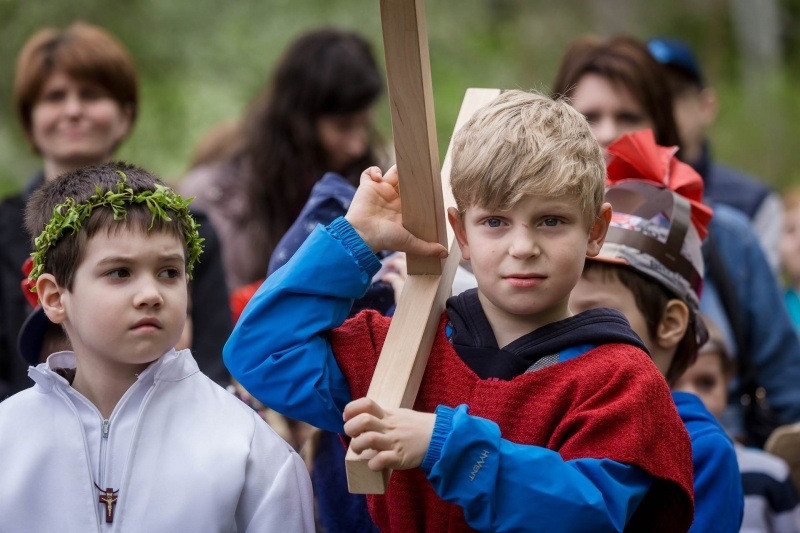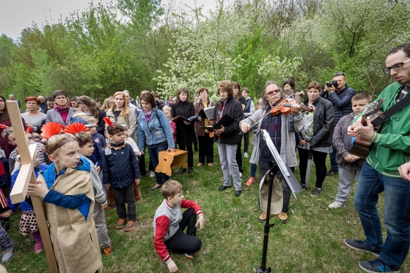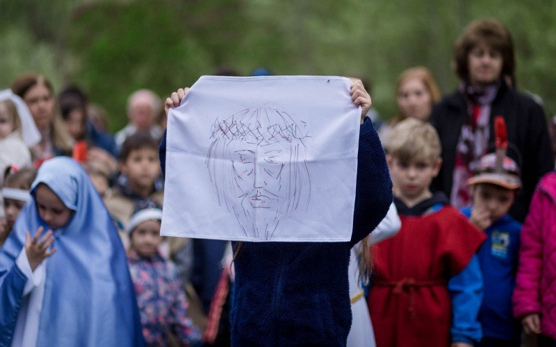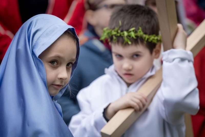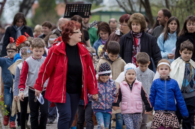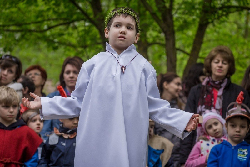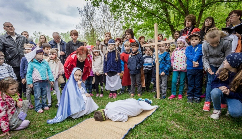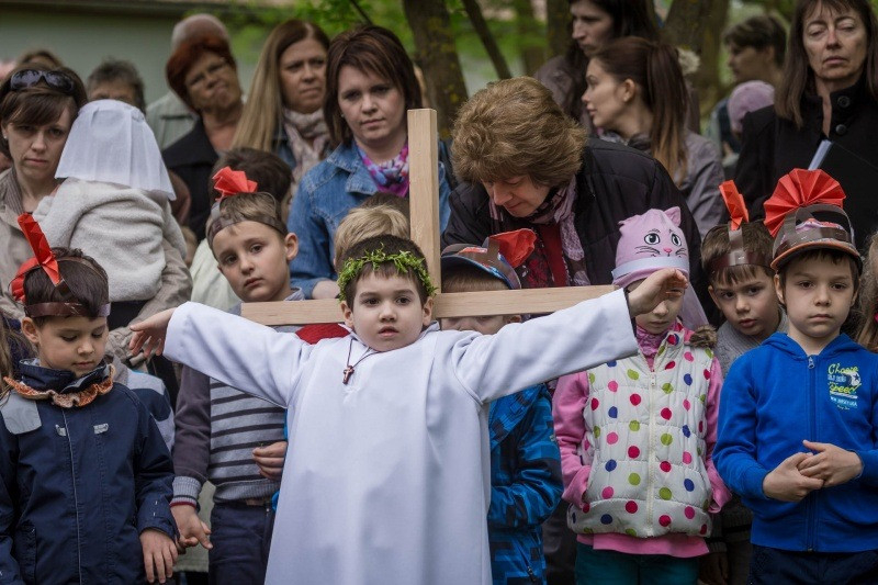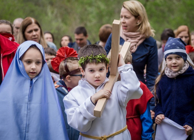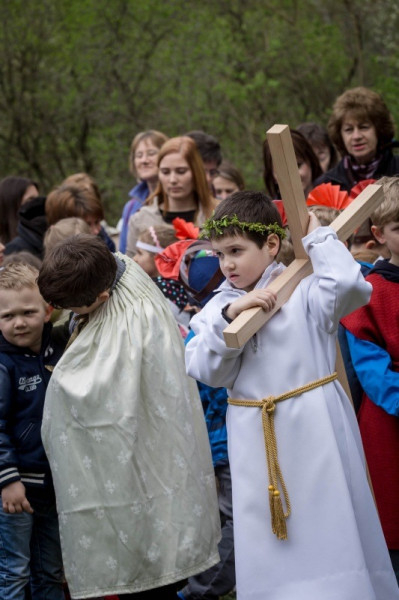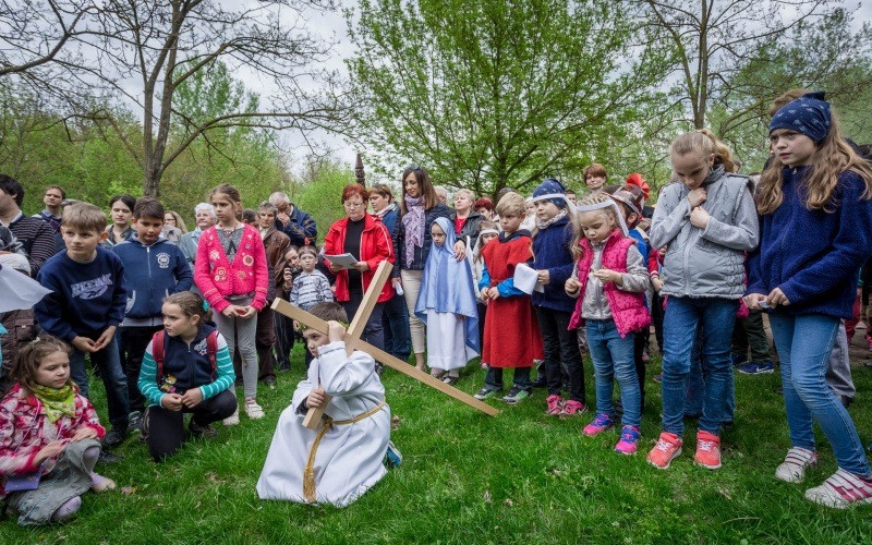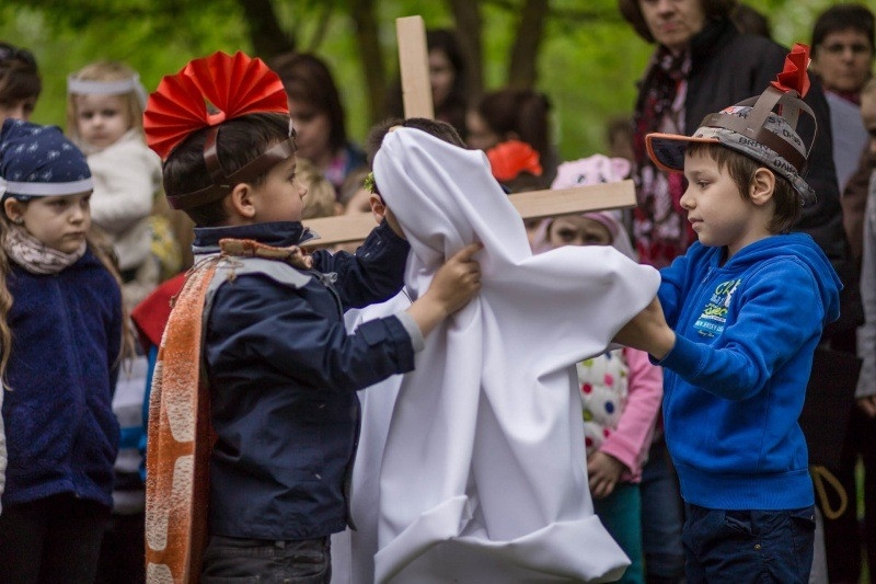 Az óvónők felkészítésével korabeli ruhákat idézve öltöztek be a gyerekek és elevenítették meg Jézus szenvedéstörténetének szereplőit. Az egyes stációkhoz kapcsolódó történéseket, szavak nélkül, pantomimszerűen adták elő a kisiskolások és óvódások. A keresztút állomásai között ismert gitáros énekek hangzottak el.