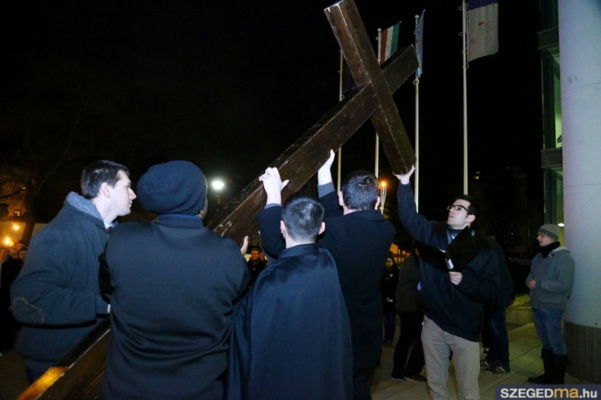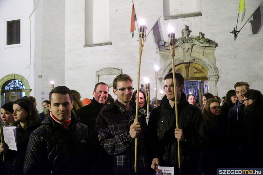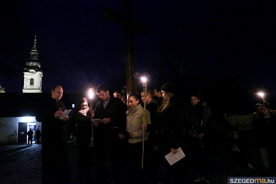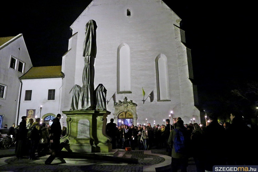A keresztet több száz fő kísérte az alsóvárosi ferences templomtól a fogadalmi templom főbejáratáig, ahol előbb a kereszt, majd a résztvevő közösségek, fiatalok, egyetemisták, papnövendékek, családok és a szegedi plébániák képviselői léphettek át az irgalmasság szentkapuján.