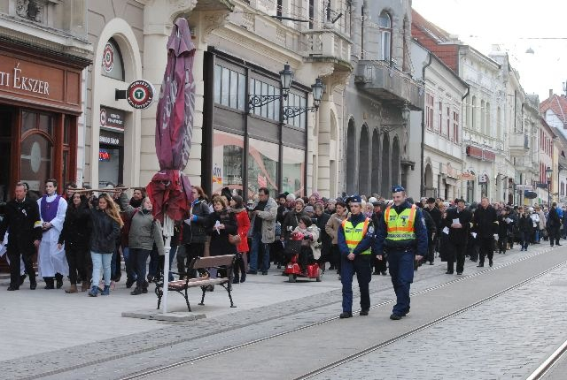 A város plébániáinak hívei a Szent Anna-templom előtt találkoztak, ahol a keresztút első stációját imádkozták. Az elmélkedések alapját a szent életű püspök, Belon Gellért gondolatai adták. A Szent Anna-templomtól a Tizeshonvéd, a Széchenyi és a Szemere utcákon át vonult a menet a Mindszenti templomig, megállva többek közt a „Tizes-honvédek” emlékműve, a Szent István- és a Kossuth-szobrok előtt is.
