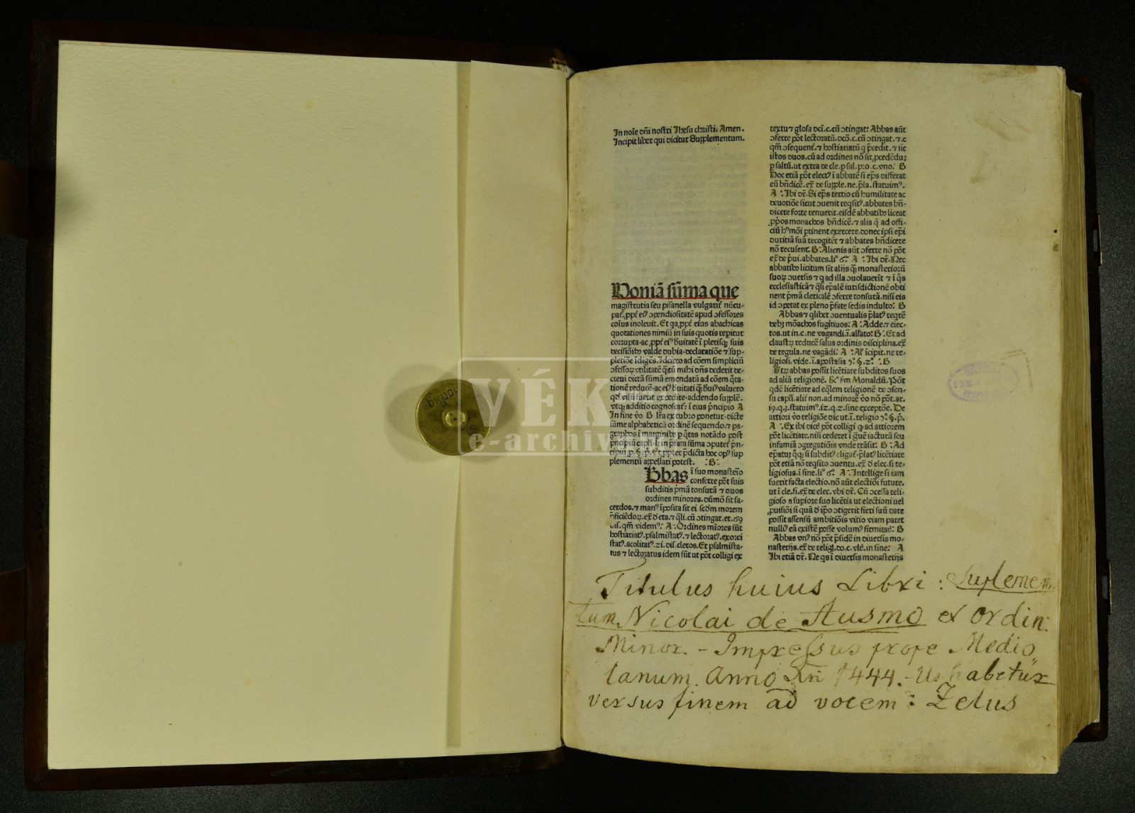 A kötet tartalmazza Nicolaus de Ausmo Supplementum summae Pisanellae című művét, amely Bartholomaeus Pisanus (1262–1347) domonkos szerzetes kazuisztikai kézikönyvéhez fűzött kiegészítéseket tartalmazza. Bartholomaeus a gyóntatások során előforduló esetek kánonjogi és morálteológiai vonatkozásait gyűjtötte össze és szedte betűrendbe. Nicolaus de Ausmo 15. században élt olasz ferences szerzetes Bartholomaeus munkájának hiányosságait egészítette ki. Megtartotta az első szerző által felállított szótárként használható sorrendet. Az eredeti szöveget „a” betűvel, saját magyarázatait pedig „b” betűvel jelölte. Ez a mű nem tudományos szakmunka, hanem olyan segédkönyv, amely gyakorlati munkájukban (szentszéki bírói, gyóntatói) segítette a klerikusokat.