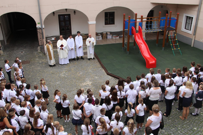 A szentmise után Radnics Zoltán piarista házfőnök atya áldotta meg az alsósok udvarán megújított játszóvárat, amelyet a szülők és az öregdiákok adományaiból készíttetett az iskola.
