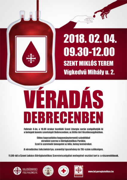 A véradást a Magyar Vöröskereszt Hajdú-Bihar Megyei Szervezetének szakmai segítségével bonyolítják le. A parókai épületében, a Vígkedvű utca 2. szám alatt, a Szent Miklós teremben lehet majd így segíteni fél 10-től 12 óráig.