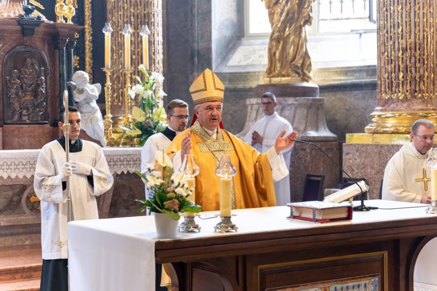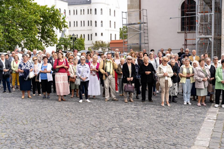 „A Nagyboldogasszony-székesegyház belső felújítása a befejezéshez közeledik, csak a karzaton magasodik állványzat, ami mögül felsejlik az új orgonaszekrény. A külső megújulás javában zajlik. Egy év múlva kerül sor a székesegyház újraszentelésére, addigra befejeződnek a rekonstrukciós munkálatok. Ez az év is különleges: ma új harangokat szentelünk – emlékeztetett a szentmise bevezetőjében Veres András megyéspüspök. – Egykor hét harang lakott a toronyban. Később, az első világháborúban rekviráltak négyet, majd a második világháború folyamán használhatatlanná vált három harangból öntötték a ma is szolgáló Magyarok Nagyasszonya-harangot. Most megérkeztek a harang testvérei. Nagy ünnep ez a Győri Egyházmegye számára. A harang Istenre irányítja figyelmünket.”
