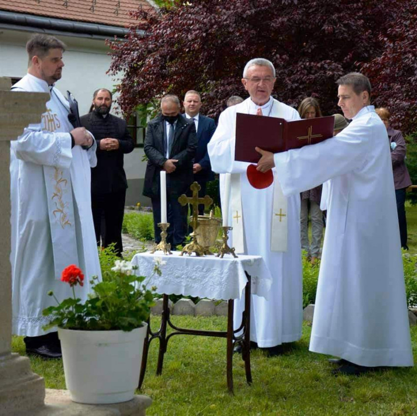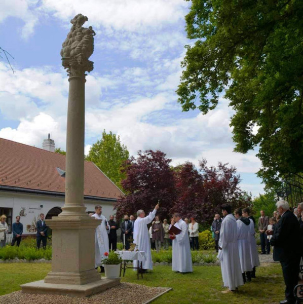 Az emlékoszlop a Szentháromság-szoborral Barátföldpusztáról került a lébényi látogatóközpont udvarára felújított állapotában, restaurálását a Magyar Képzőművészeti Egyetemen végezték. A szobor megáldása előtt Zomborácz Tamás restaurátor röviden ismertette a helyreállítás történetét.