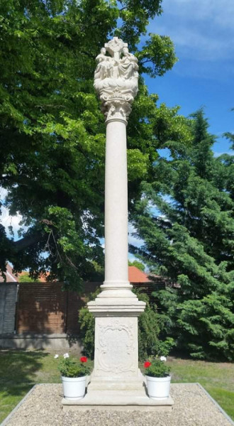 Az emlékművet 1754-ben Eva Gerlachi készítette a Szentháromság tiszteletére. A 60×60×80 centiméter magas, felső és alsó szegélyén is párkánydíszes kőhasábon öt méter magas, korinthoszi fejezettel záródó homokkő oszlop áll, melyen a Szentháromság szimbolikus ábrázolása látható. Az emlékmű alapzatát képező, vaskerítéssel övezett kőhasábon barokkos növényi ornamentikával szegélyezett mezőben a következő felirat áll németül: Ezt az oszlopot Gerlachi Éva asszony készíttette a Szentháromság tiszteletére 1754.