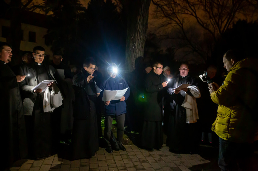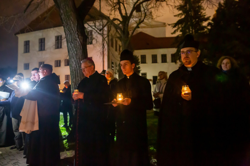 A résztvevők a mécseseket elhelyezték a szobor előtt, és átvonultak a székesegyházba, ahol Bognár István spirituális vezetésével elénekelték az esti dicséretet, orgonakíséret mellett.