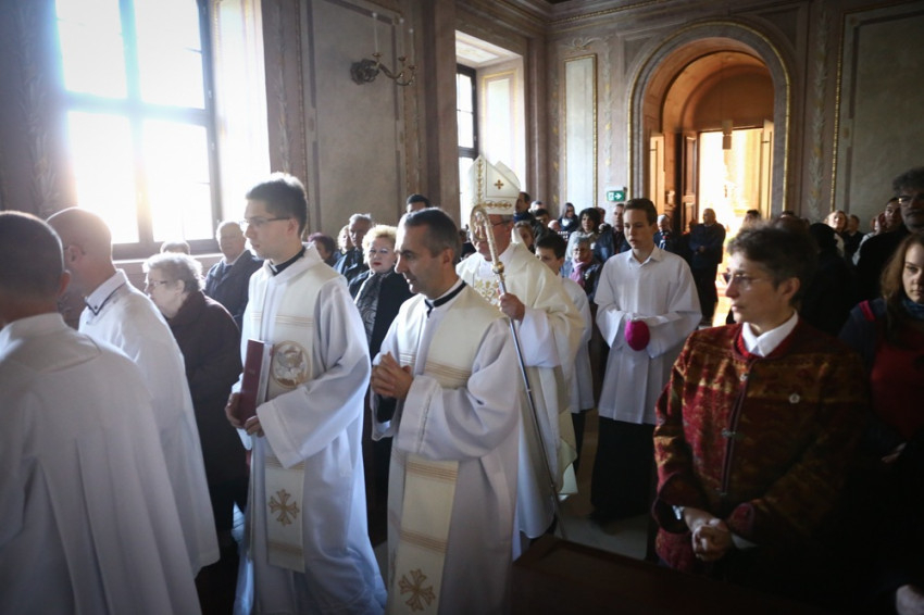 A Madonna-kápolna felszentelési szertartását magába foglaló, a felújított kápolna oltáránál bemutatott szentmise a vízszenteléssel kezdődött. Újraszenteljük a megújított kápolnát, hogy a közösségünk lelki templommá növekedjék, és összegyűlve az oltár körül gyarapodjék az égi szeretetben – imádkozott Veres András püspök a szertartás elején.