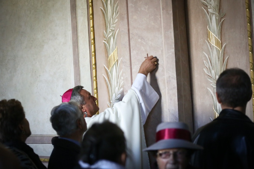 A homília után a Mindenszentek litániája elimádkozásával folytatódott a liturgia, amit a szentelés szertartása követett. Veres András a szenteltvízzel meghintette a falakat, majd az oltárt kente meg krizmával, és meggyújtotta a tömjént, az Isten dicsőítését kifejező lángot, végül pedig feldíszítették az oltárt, és a felajánlással folytatódott a szentmise.
