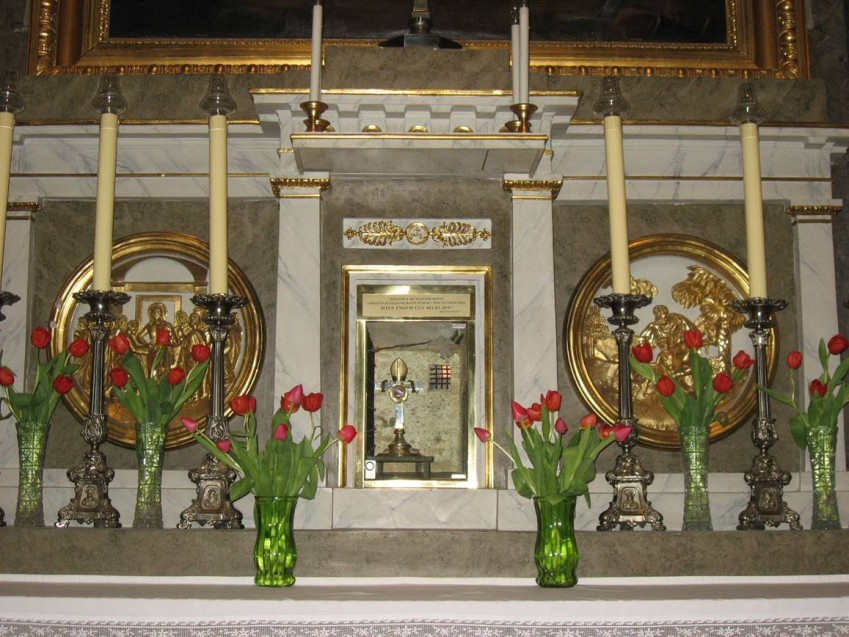A templomban őrzik a mártír püspök csontereklyéjét, mégpedig azon a mellékoltáron, amelyet esztergomi segédpüspökként egykor ő maga szentelt fel. Az egyedi ereklyetartó egy olyan ereklyeházban látható az oltáron, mely a kistarcsai internálótábor azon celláját mintázza, amelyben Meszlényi püspököt fogva tartották, és ahol végül a kínzások és a megpróbáltatások következtében meghalt.