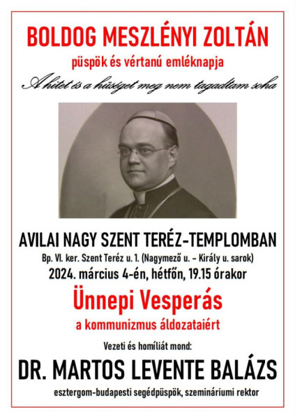 Boldog Meszlényi Zoltán püspök egyik mai utódaként a szentmisén homíliát mond, majd az ünnepi énekelt vesperást vezeti Martos Levente Balázs esztergom-budapesti segédpüspök, a Központi Papnevelő Intézet rektora. (A paptestvérek és a hívek szeretettel köszöntik Balázs püspök atyát ezen az alkalmon, hiszen éppen egy évvel korábban, március 4-én szentelte püspökké Erdő Péter bíboros, prímás, érsek a budapesti Szent István-bazilikában.)