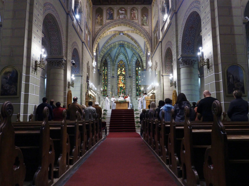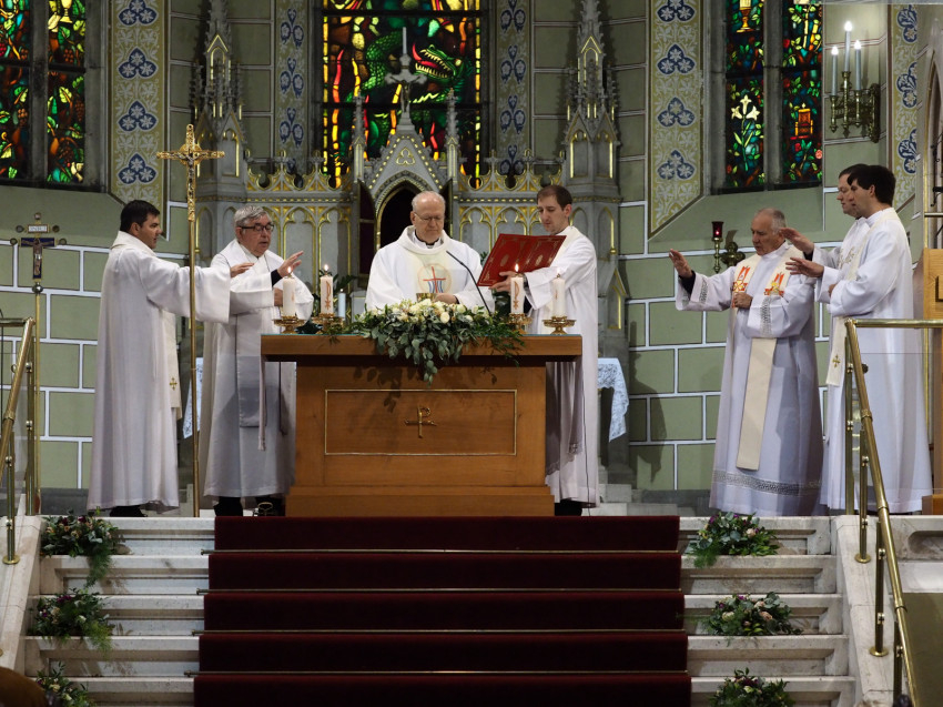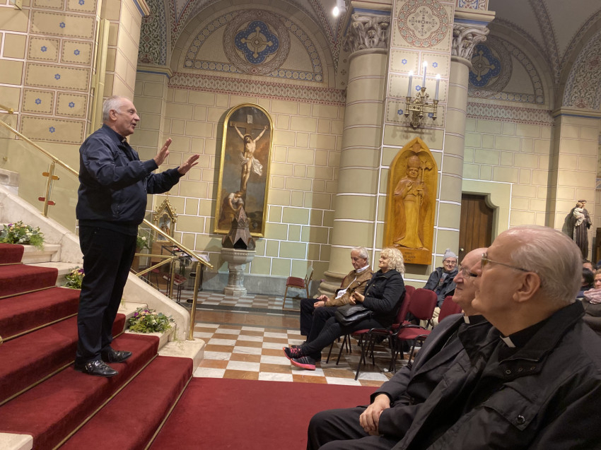 A kiállítások megtekintése után Erdő Péter szentmisét mutatott be a Szent Mihály-bazilikában a vele érkezett papokkal, Urbán Gábor kanonokkal, a főegyházmegye vagyonkezelőjével, Kelemen Imre irodaigazgatóval, Varga Norbert titkárral és Depaula Flavio szalézi szerzetessel. Koncelebrált Nagy Károly apát, kanonok, a veszprémi bazilika plébánosa és Felker Zsolt káplán is.