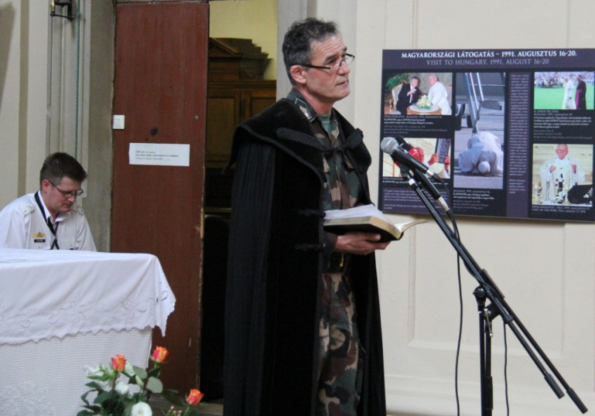 Szabó György alezredes, protestáns tábori lelkész Sámuel első könyvéből a szabadító Istenről szólt, aki az elesetteknek erőt ad. Mi is elesettek vagyunk, hiszen gyászolunk, a halálba kényszerített magyar katonák százezreire emlékezünk most főhajtással, mondta. Az emberiség történelme megmutatta: a háború sohasem lehet igazságos, mert az erőszak csak újabb erőszakot szül. Jézus viszont, akit halálba taszított a gyilkos indulat, kétezer éve legyőzhetetlen, mert a szeretet legyőzhetetlen. Bűnbánattal emlékezzünk tehát elődeinkre, és hálát adva Istennek, hogy két világégés után is itt élhetünk a Kárpát-medencében, ahol őseink megtelepedtek. S kérjük őt mint a történelem Urát, hogy segítsen minket egyéni érdekeinket alárendelni nemzeti érdekeinknek, s erősítsen meg minket a békés jövő építésében.