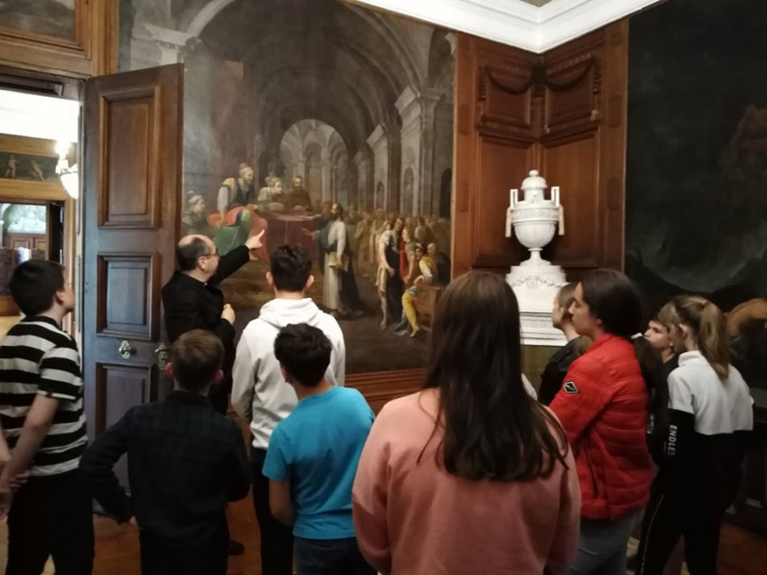 Tizenkét órára várt bennünket a püspök atya. Az Úrangyala elmondása után felmentünk egy hosszú lépcsőn, majd letettük iskolatáskáinkat, és elindultunk az épület megtekintésére.