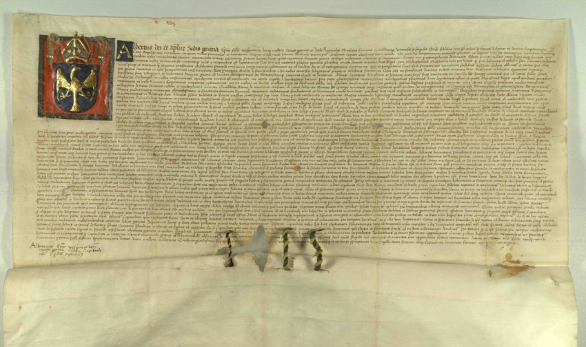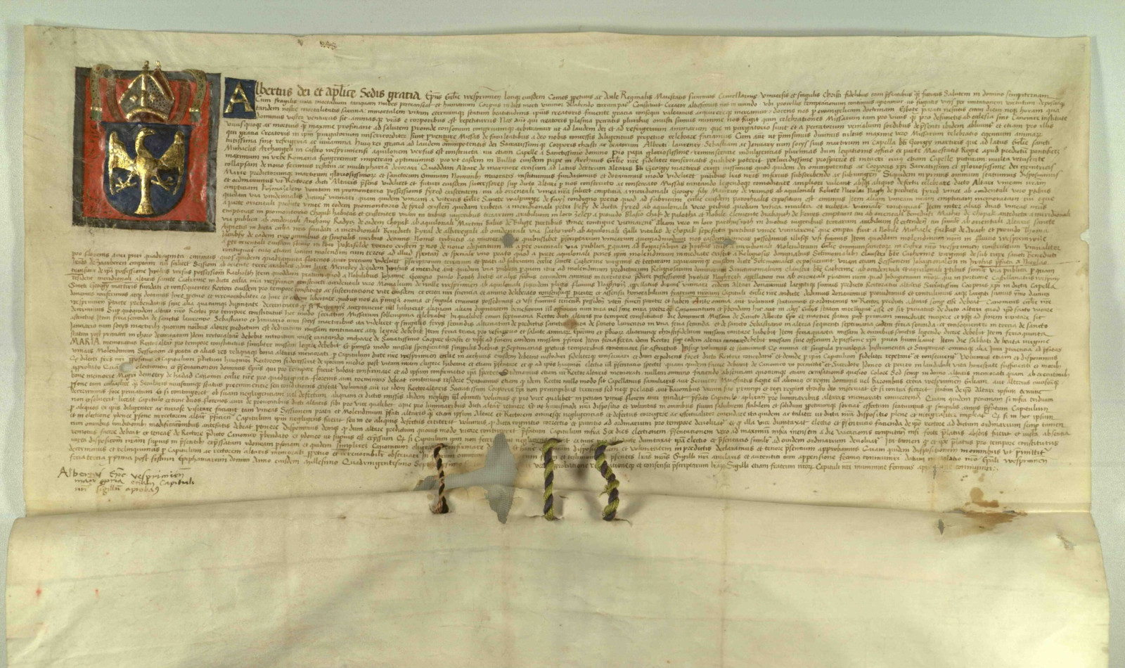 Vetési Albert Hunyadi Mátyás kedvelt diplomatája volt, többször megfordult a budai királyi udvarban – nem mellesleg háza is volt a városban –, így alkalma lehetett a Corvina könyvtár műhelyének mestereit alkalmazni saját kancelláriáján: ennek egyik máig fennmaradt példája az oklevélen látható díszes címerrajz és iniciálé.