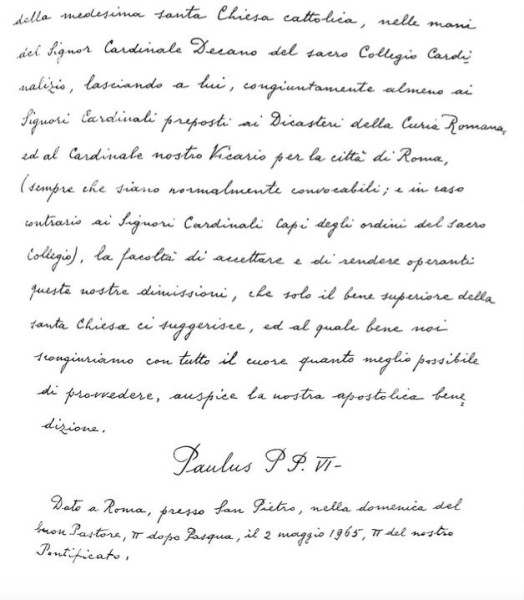 Az alábbiakban először ennek az esetleges lemondó levélnek a fordítását közöljük, utána pedig annak a néhány sornak a fordítását, amelyet a jelenlegi Szentatya, Ferenc pápa írt az említett kötethez.