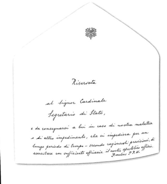 A csatolt levelet, mely a Szent Bíborosi Testület dékán bíborosának szól, az Államtitkárunkként szolgáló bíboros úr olvashatja el, és neki kell átadnia – a belőle következő eljárás megvalósítása érdekében – a dékán bíboros úrnak abban az esetben, ha súlyosan megbetegednénk, vagy más súlyos akadály lépne fel, mely meggátolná, hogy előreláthatólag hosszú időn keresztül apostoli hivatalunkat kellő hatékonysággal gyakoroljuk.
