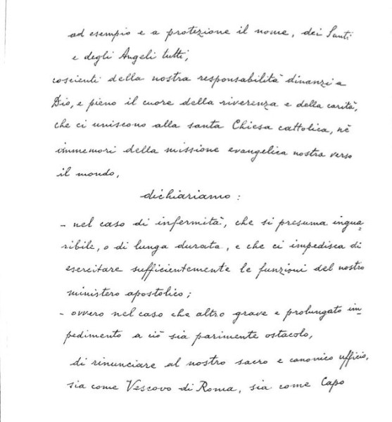 lemondunk szent és kánoni hivatalunkról, mint Róma püspöke, és mint ugyanazon katolikus Anyaszentegyház vezetője, a Szent Bíborosi Testület dékánjának kezébe, őrá hagyva, és vele együtt legalább a Római Kúria dikasztériumait vezető bíboros urakra és azon bíborosra, aki vikáriusunk Róma városa számára (feltéve, hogy rendesen összehívhatók; vagy ellenkező esetben a Szent Bíborosi Testület rendjeinek vezető bíborosaira) azt a jogot, hogy e lemondásunkat elfogadják és annak megfelelően eljárjanak; lemondásunkat egyedül az Anyaszentegyház legfőbb java sugallja nekünk, és erről a legfőbb jóról kívánunk egész szívünkből a lehető legjobb módon gondoskodni, apostoli áldásunk segítségével.