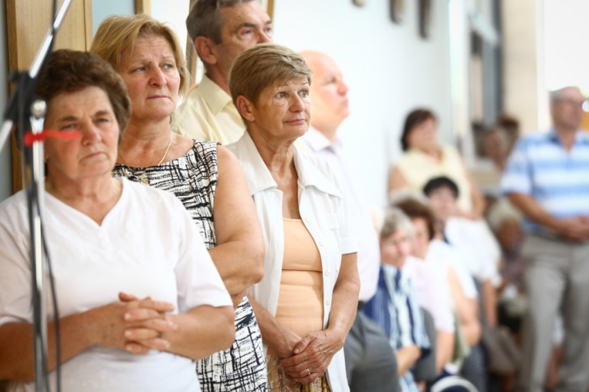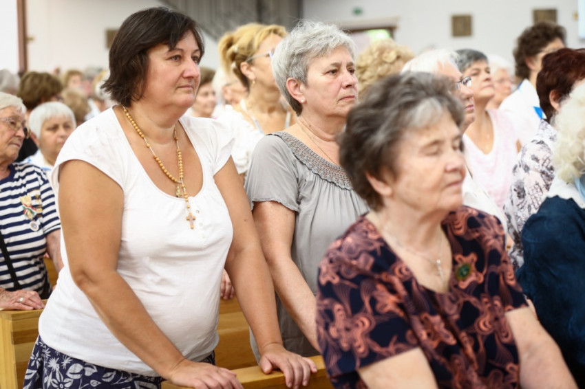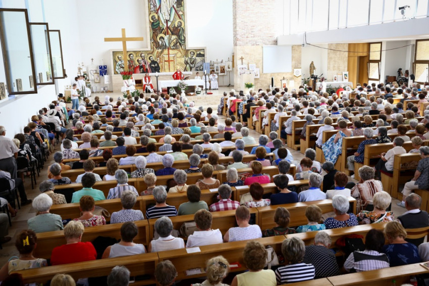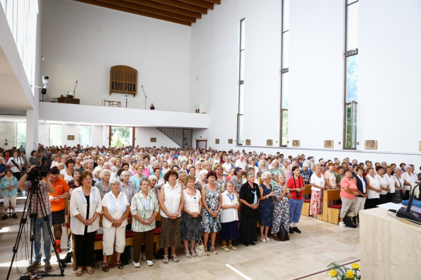 Az oltárt kétfelől övező zászlók sokasága árulkodott arról, mely településekről érkeztek zarándokok. A segítők, a templomot színültig megtöltő hívek közt kis fonott kosarakban gyűjtötték az imaszándékokat.