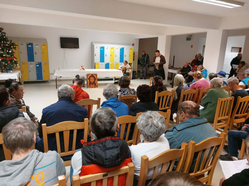 Advent második hetében a győri Hajléktalanokat Segítő Szolgálathoz látogattunk el az Avar utcába. A hajléktalanszállón már ismerős arcok köszöntöttek minket, többen lelkesen idézték fel, hogy tavaly is részt vettek az imádságunkon. Velük a közösségünk szegényekért végzett imádságát mondtuk el. Idén két dologban is változott az itteni forgatókönyvünk: az imádság után egy kis agapéra invitáltuk a résztvevőket, mi is együtt ettünk velük. Majd miután nekik is átadtuk a gyermekrajzokat, a betegszobákba is ellátogattunk, így azokat is meg tudtuk ajándékozni, illetve azokkal is tudtunk beszélgetni, találkozni, akik a betegségük miatt nem tudtak részt venni az imádságon.
