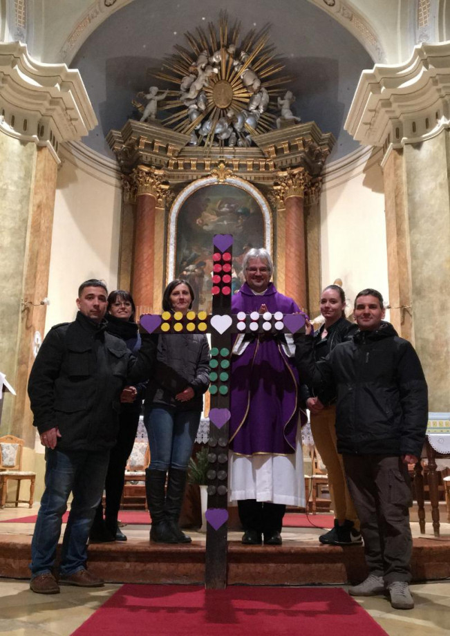 A templom nagypénteki keresztjére ötször nyolc, összesen negyven színes hengert erősítettek, melyek így öt hatalmas legókockát jelenítenek meg. Előtte természetesen mind a negyven hengert feltöltötték legós kiegészítőkkel, illetve legó minifigurákkal. Arra is figyeltek, hogy a kockák közé lila szívek kerüljenek, középre pedig egy fehér szív, utalva a nagyböjti bűnbánati időre és a húsvétra. A kockák színvilágában pedig megjelennek mind a magyar trikolór, mind a pápai zászló színei.