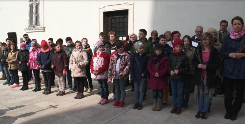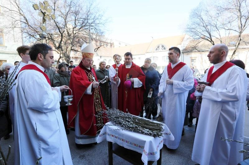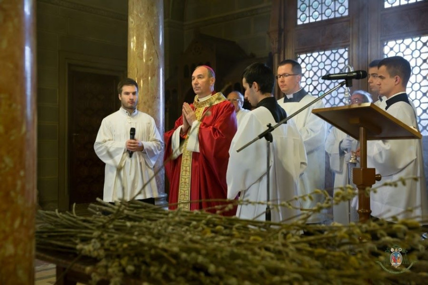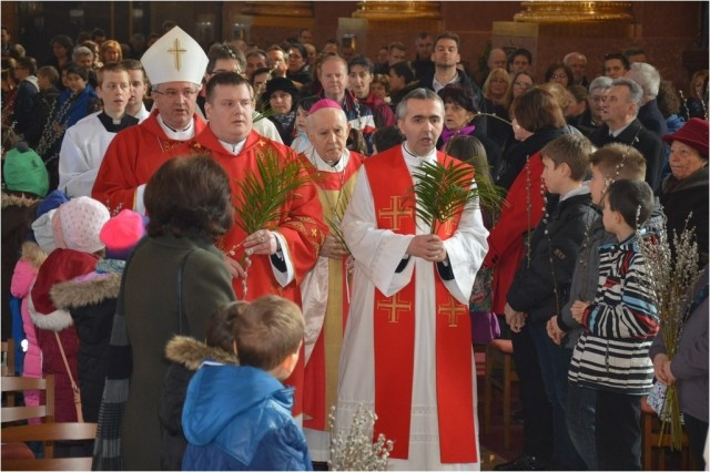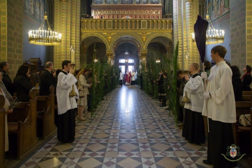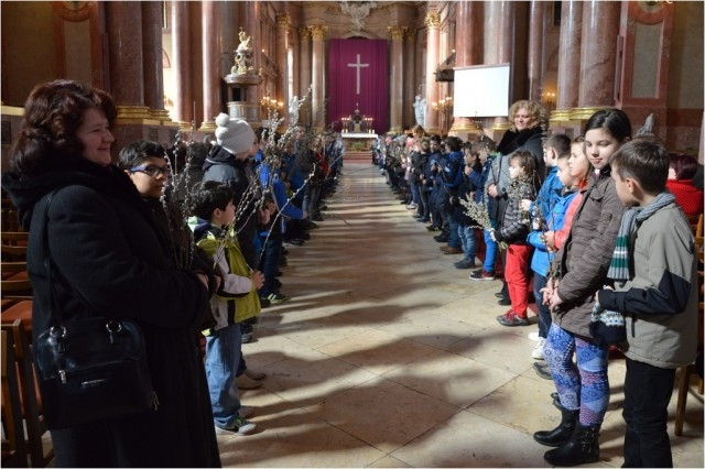 A székesfehérvári székesegyházban Spányi Antal megyéspüspök mutatta be a virágvasárnapi ünnepi szentmisét, amely a hagyományos barkaszenteléssel és körmenettel kezdődött, éneklő hittanos gyerekek kíséretében.